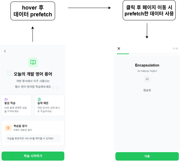 이 방식대로 적용하면, 버튼 hover → prefetch 실행 → 버튼 클릭 → 캐시 데이터 즉시 렌더 순서가 된다.