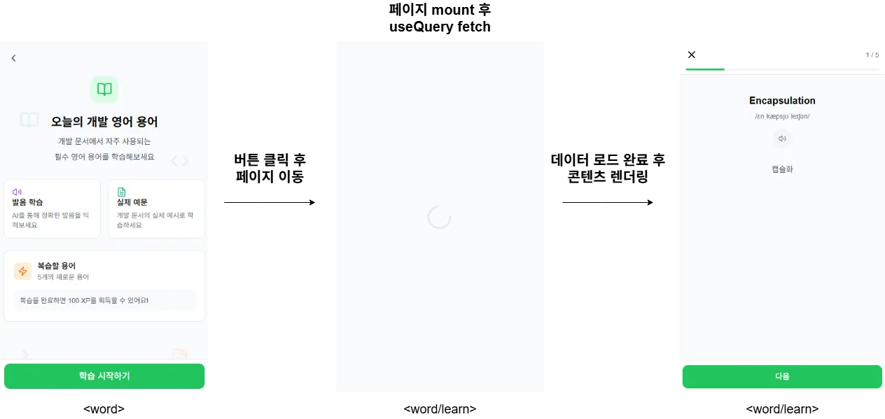 위 그림을 보면, 버튼 클릭 후 페이지 전환 → 페이지 마운트 후 useQuery fetch → 로딩 스피너 표시 → 데이터 로드 완료 후 콘텐츠 렌더링 순서다.