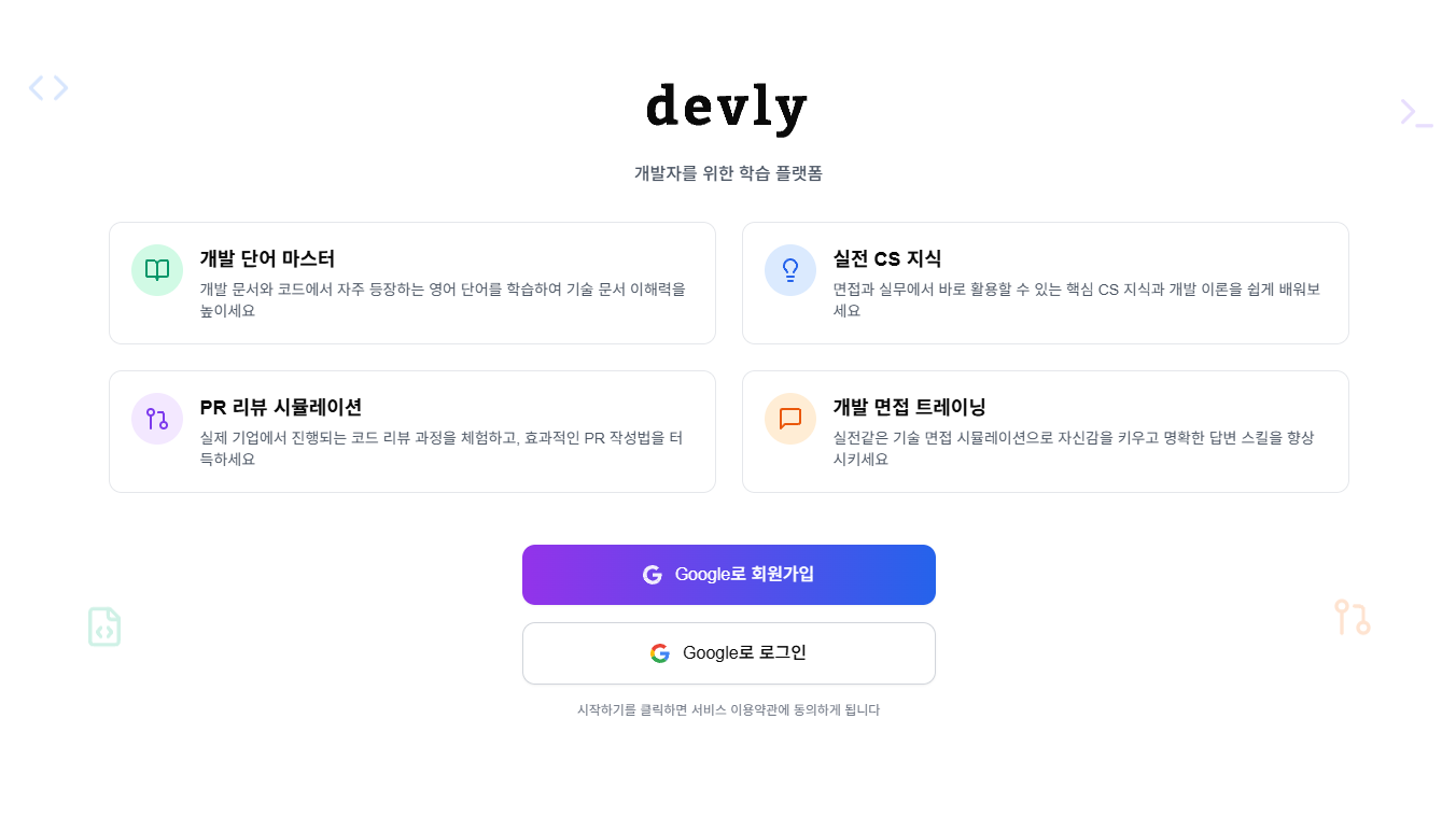 내 프로젝트의 메인 페이지에는 네 가지 주요 기능(개발 용어, 개발/CS 지식, 모의 PR, 모의 면접)이 있다.