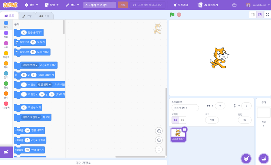 하지만 버튼 아이콘이 고양이 모양이라, 학생들이 이게 스프라이트 추가 버튼이라는 것을 잘 알아차리지 못했다.