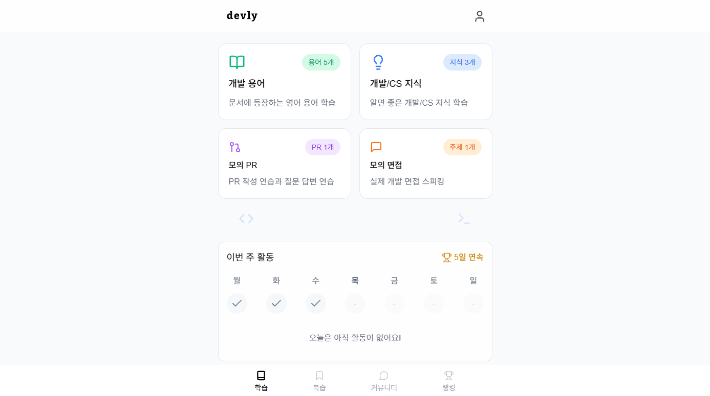 - 복습·커뮤니티·랭킹과 같은 후순위 기능은 네비게이션 바로 분리해 접근하도록 개선했다.
